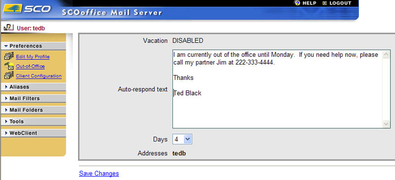 Users may set up vacation messages to automatically respond to anyone who sends them messages while they are out of the office. Users simply type a message and then save the message to enable the automatic vacation notification.