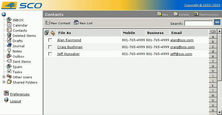 Users may create contact lists, and then securely access those contacts from anywhere in the world. Users may also share their contact list with other users. In addition, businesses may set up shared contact lists of office staff, customers, suppliers, etc.